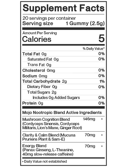 Mojo ingredients are vegan, cruelty-free, gluten-free, natural, and selected with precise intentionality to stack compounds in perfect harmony to achieve our signature microdose experience. Some of these highly valuable ingredients include Lion’s Mane, Ginseng, Cordyceps, Mucuna Pruriens.
