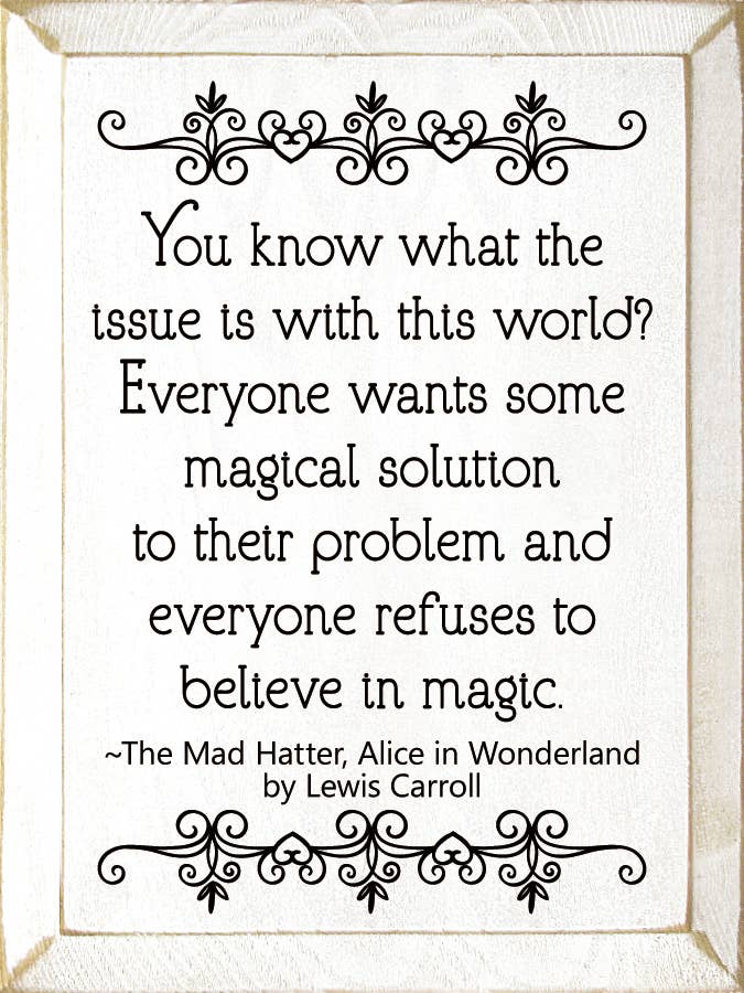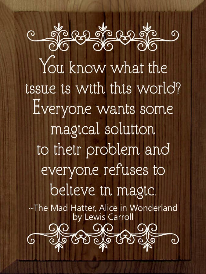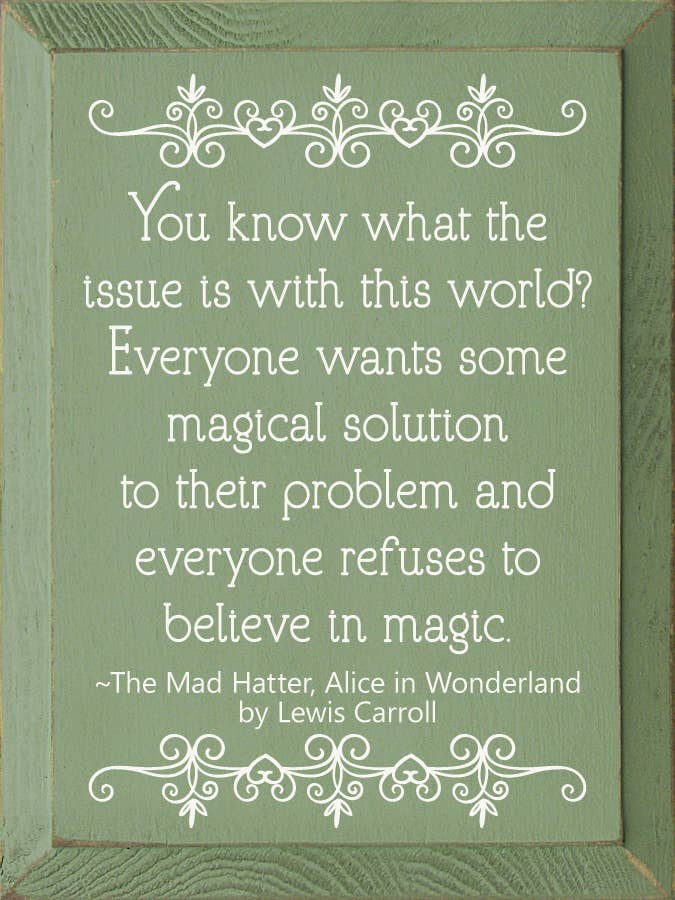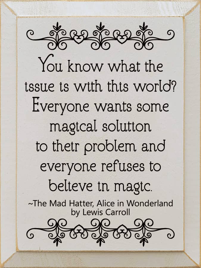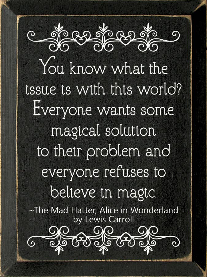You know what the issue is with this world? Everyone wants so magical solution to their problem, and everyone refuses to believe in magic. - The Mad Hatter, Alice in Wonderland by Lewis Carroll Our pieces are made from solid knotty pine, so please allow for slight imperfections - as wood is imperfect by its nature - but only adds to the character of the product. It is intended to have a rustic, old look and feel. Expect knots, variance in color, and natural cracks - as well as small edge “dents” or chips.